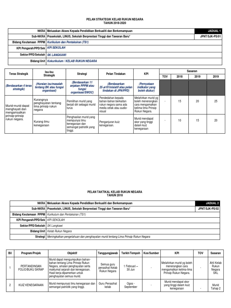 PELAN STRATEGIK KELAB RUKUN NEGARA TAHUN 2017-2020 NKRA Meluaskan Akses Kepada Pendidikan Berkualiti dan Berkemampuan JADUAL 1 Sub-NKRA Prasekolah LINUS Sekolah Berprestasi Tinggi dan Tawaran Baru JPNTSJK-PS01 Bidang Keutamaan PPPM Kurikulum dan Pentaksiran TS1 KPI PengarahPPDSek KPI SEKOLAH SektorPPDSekolah SK TENGKU. View peranc straregik Kelab Rukun Negaradocx from PJ 101 at Sekolah Kebangsaan Sungai Kechil Ulu. Baca versi flipbook dari Kelab Rukun Negara.