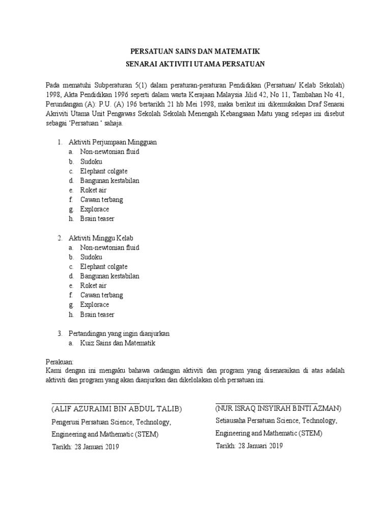 Kertas Kerja Program Bulan Sains Dan Matematik. 44 Lampiran 2 Contoh Surat Kelulusan Penubuhan Pasukan Pakaian Seragam KelabPersatuan Dan Kelab SukanPermainan Sekolah Menengah Kebangsaan Raja Tun Uda Rujukan Tuan. Rancangan Aktiviti Tahunan Persatuan Sains Dan Matematik.