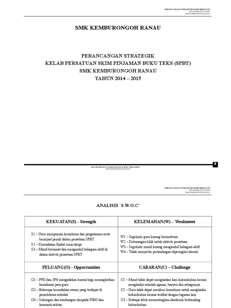7 Menyimpan buku-buku SPBNT di tempa yang dikhaskan BOSS. Dalam usaha bagi merealisasikan pendidikan dan pembangunan modal insan yang cemerlang antara pendekatan dilaksanakan ialah menyediakan satu kerangka perancangan strategik untuk melaksanakan mandat kerajaan melalui penjelasan visi dan misi menganalisa persekitaran pemilihan fokus. 13 rows Pelan Taktikal Pengurusan Skim Pinjaman Buku Teks SPBT TAHUN 2013 BIL.