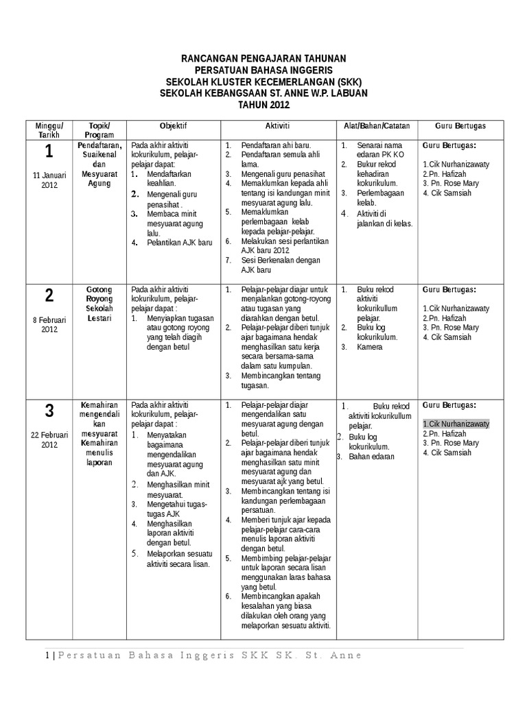 Rancangan aktiviti tahunan persatuan bahasa inggeris 2013 minggu program objektif aktiviti alatbahancatatan 1 mesyuarat pada akhir 1. Posted by pendidik at 0945 0 comments. Laman ini membolehkan para guru bahasa malaysia memuat turun contoh rancangan pengajaran tahunan bm kssr.